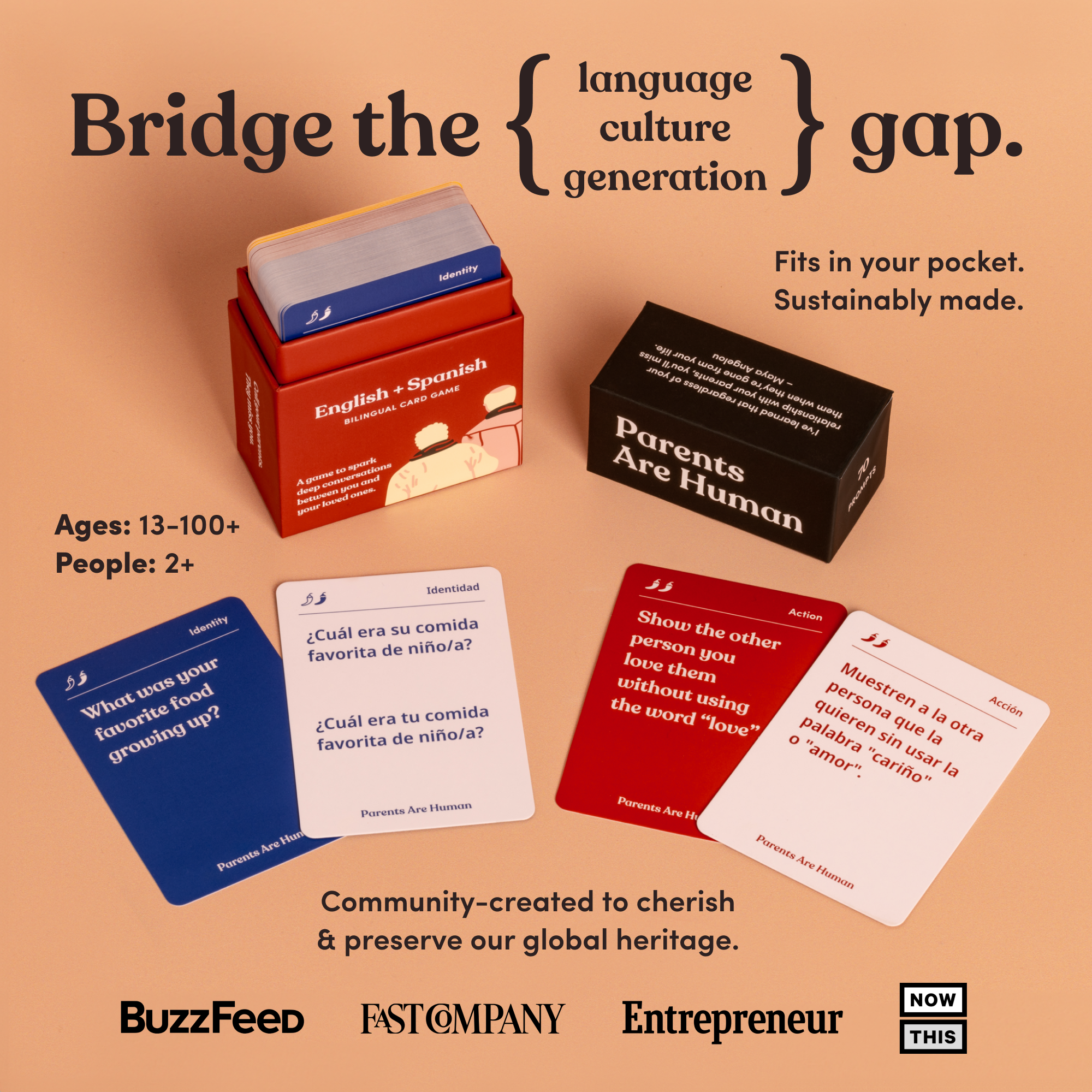 This edition has our full game in English on the front of each card and Spanish (Neutral Spanish/Español Neutro) on the back to help bridge language, culture, and generational gaps.